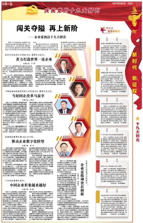 2017年10月21日出版的《经济日报》,在《庆祝党的十九大特刊》版面(11版),以“企业家热议十九大报告”为主题,刊登了五位企业家的采访报道。其中,报道集团党委书记、董事长马正武的题目是《当好国企改革马前卒》。全文如下: